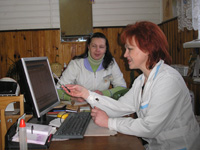 На здымках: старшая медсястра Таццяна Вашкевіч і памочнік урача Алеся Канаплёва абмяркоўваюць за камп’ютарам новую версію праграмы “Урач агульнай практыкі”.