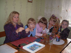 Последние гости недели открытых дверей ученики СШ №4. Шестнадцать первоклассников после концерта на глиняных свистульках и знакомства с черепахой продолжают «свое путешествие». Алла Мисник, руководитель «Волшебного лоскутка», показывает, что игрушки делают не только на фабриках и не из целых материалов, а их можно сшить своими руками из тканевых кусочков. Она обещает научить детей лоскутной мозаике. Мастер-класс бисероплетения проводит Елена Савченко: пару минут и